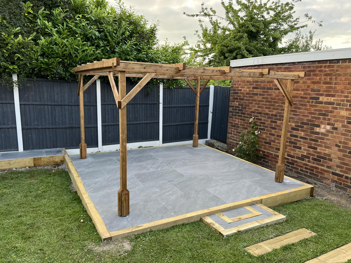 Transformed outdoor space with two patios and a beautiful pergola installation.