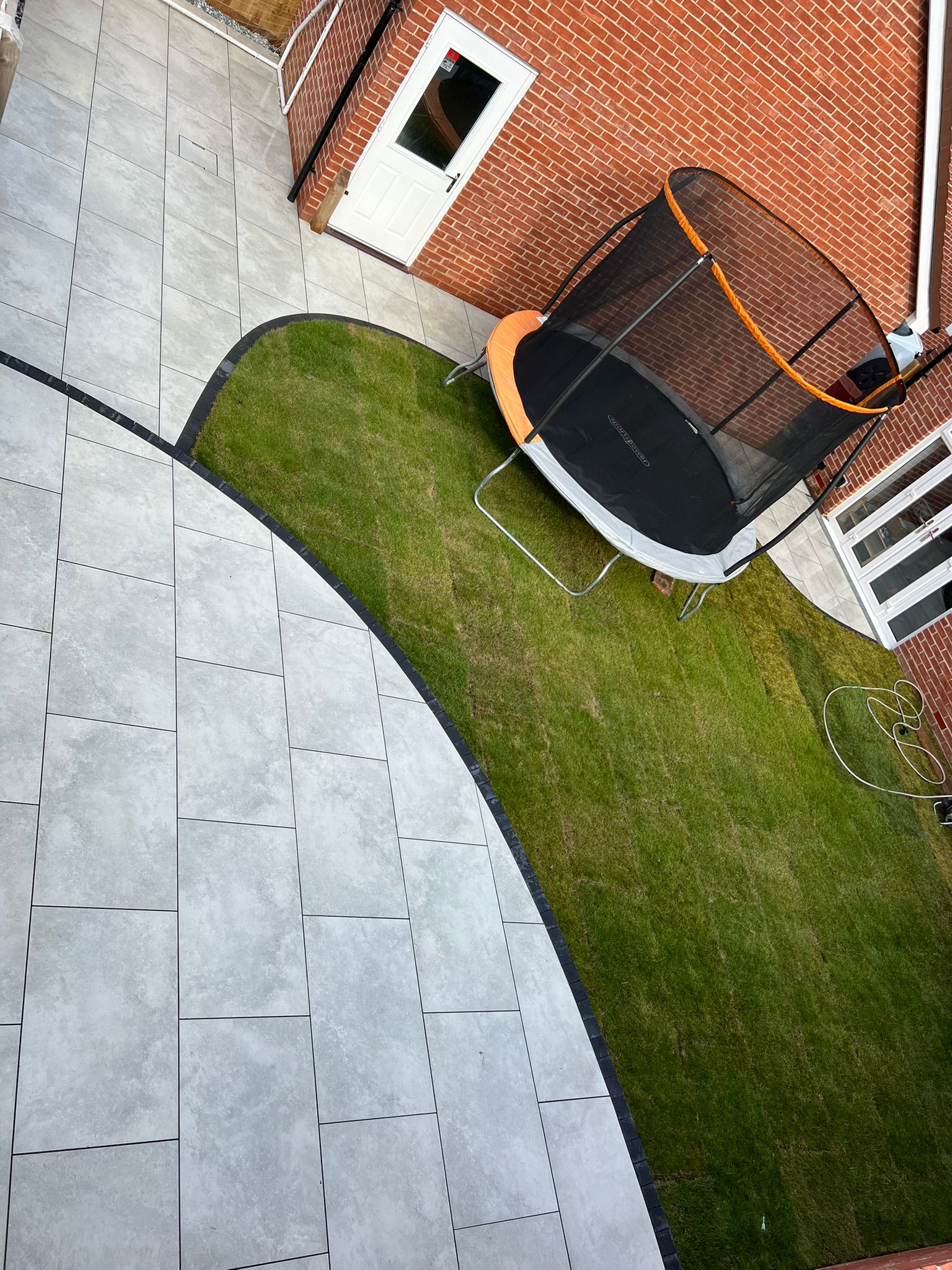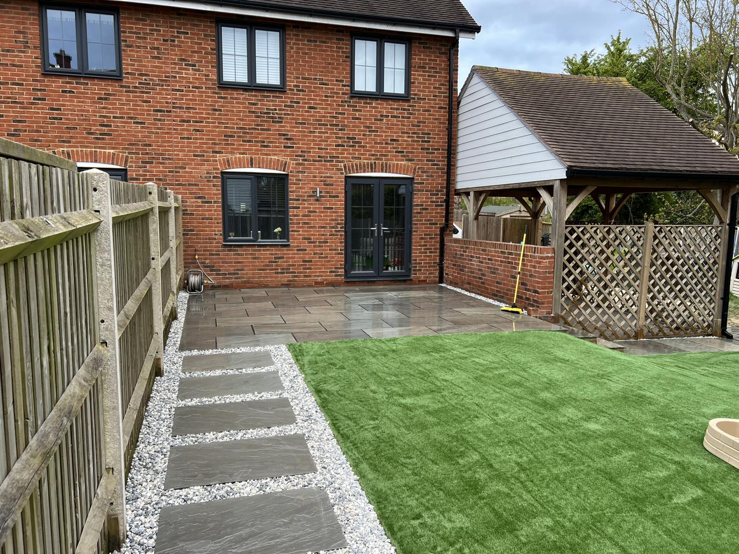 Stunning transformation: artificial grass, 37m² Kandla grey sandstone, decorative stepping stones.