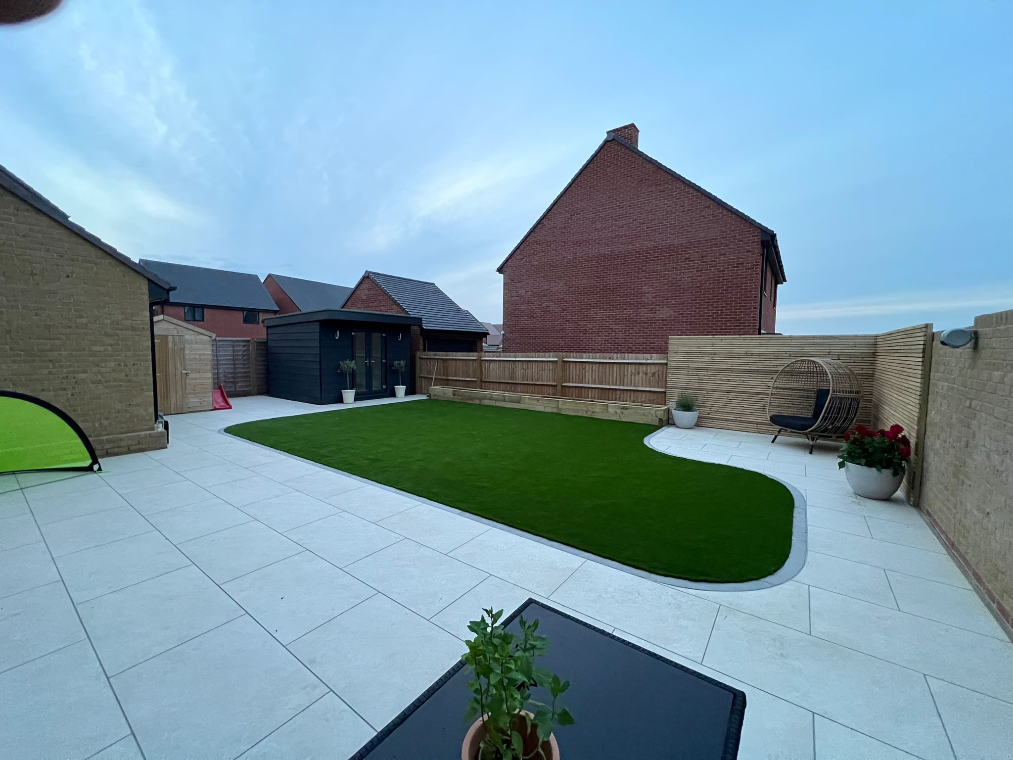 Complete garden transformation with a custom-built office, hand-cut slabs, feature wall, and artificial grass.