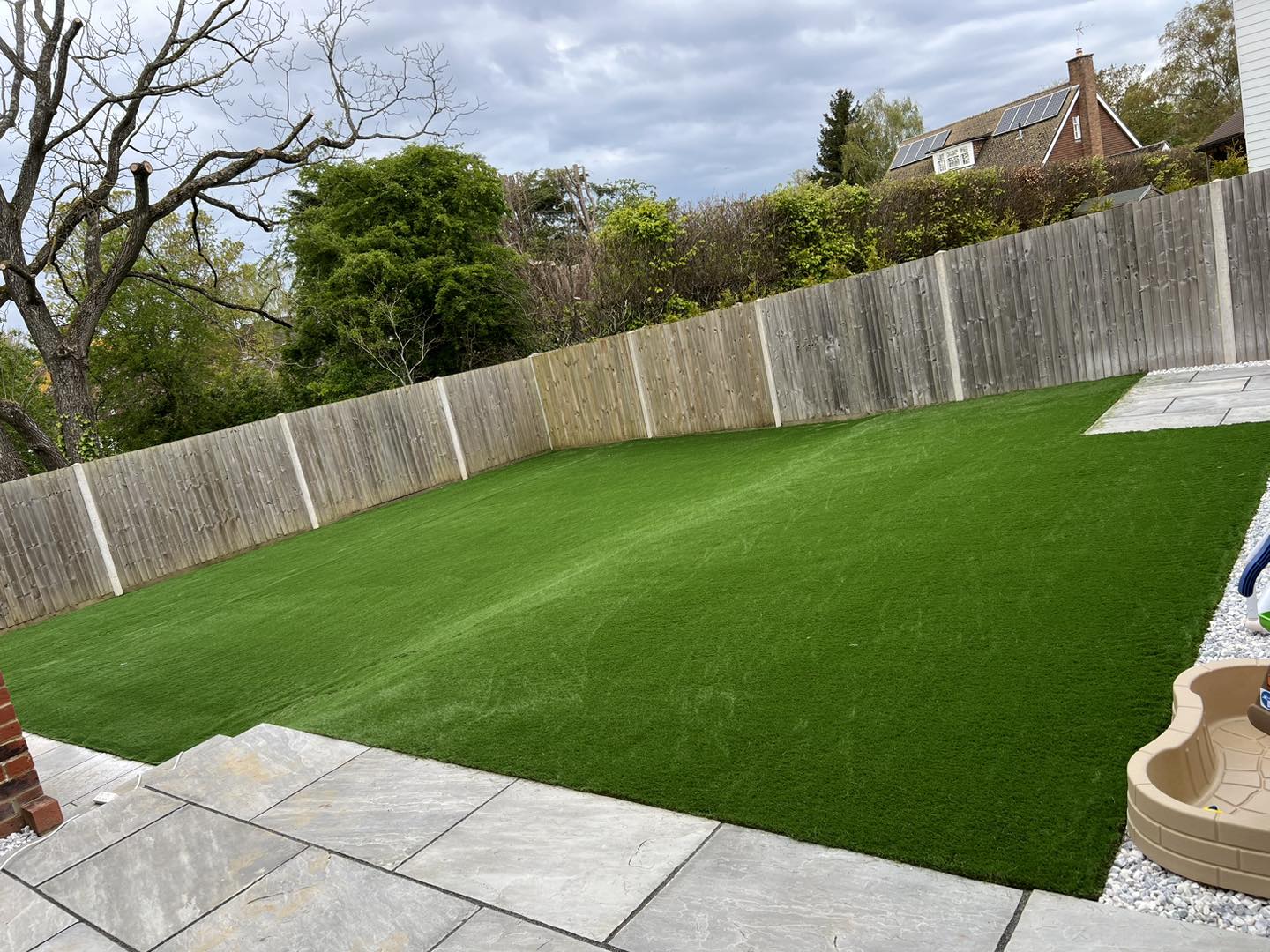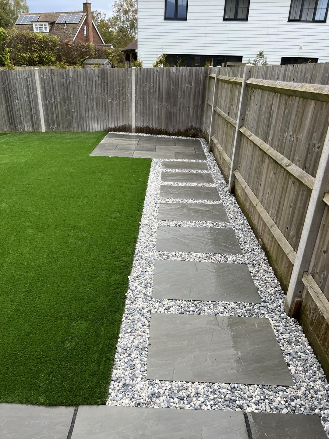 Stunning transformation: artificial grass, 37m² Kandla grey sandstone, decorative stepping stones.